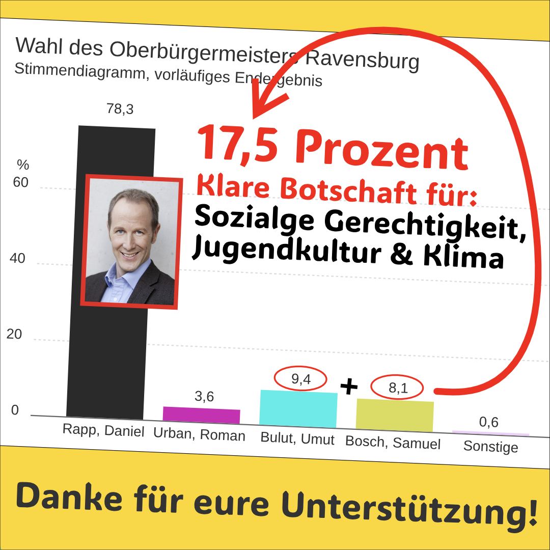 Um Wähler:innen, die sich eine schnellere und sozialgerechtere Klimapolitik wünschen, sichtbar zu machen und der Opposition eine Option zu geben, habe ich, Samuel Bosch, mich für den 8. März in Ravensburg zur Oberbürgermeisterwahl aufstellen lassen. Übrigens ist Umut Bulut auch ein unterstützenswerter Kandidat für Ravensburg.